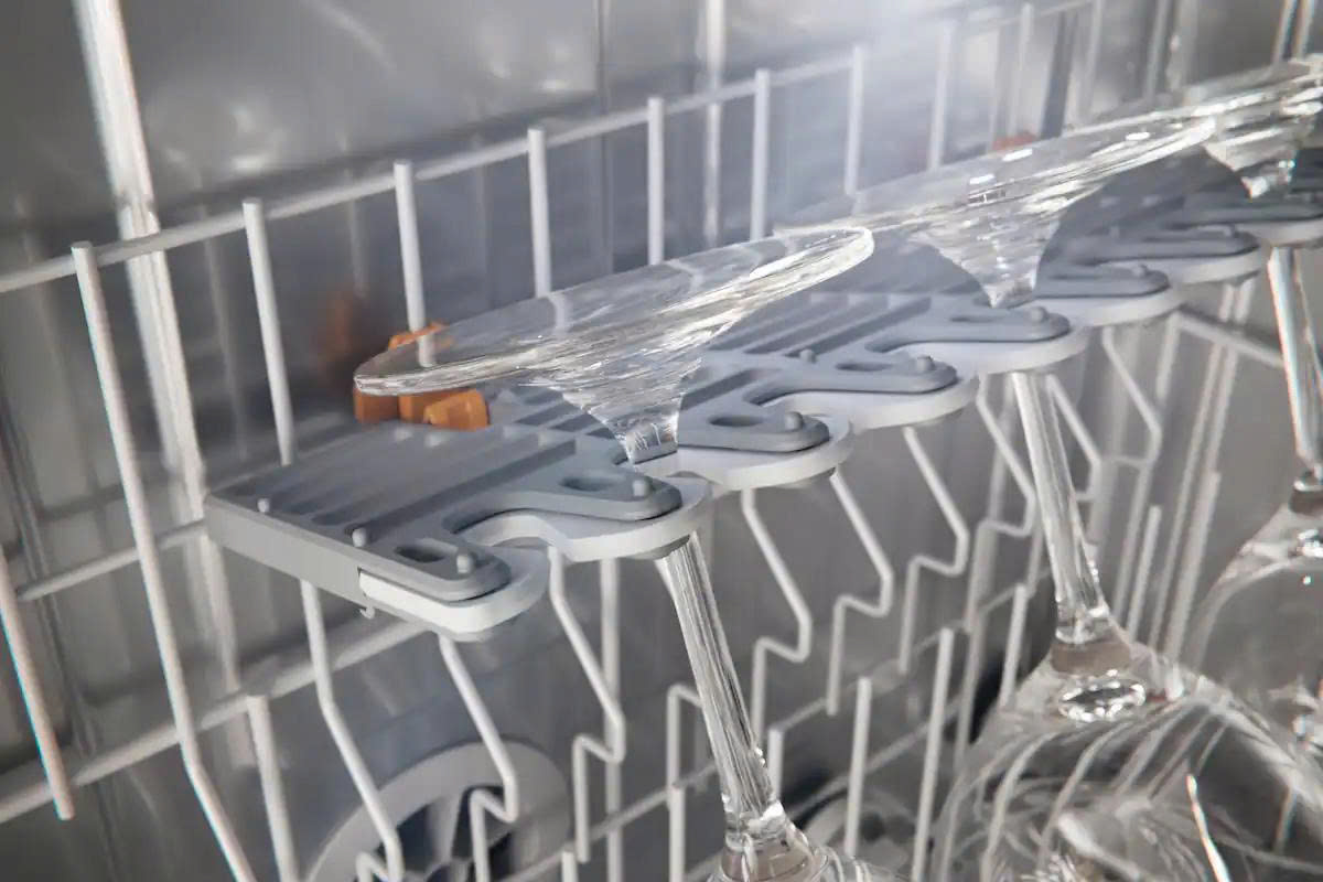 Máy rửa chén Miele được trang bị giá đỡ ly FlexCare, giúp giữ chắc chắn ly rượu chân dài nhờ các miếng đệm silicon mềm mại. Ly được đặt nhẹ nhàng nhưng vẫn đảm bảo an toàn tuyệt đối trong suốt chu trình rửa, không để lại cặn nước hay bụi bẩn.
